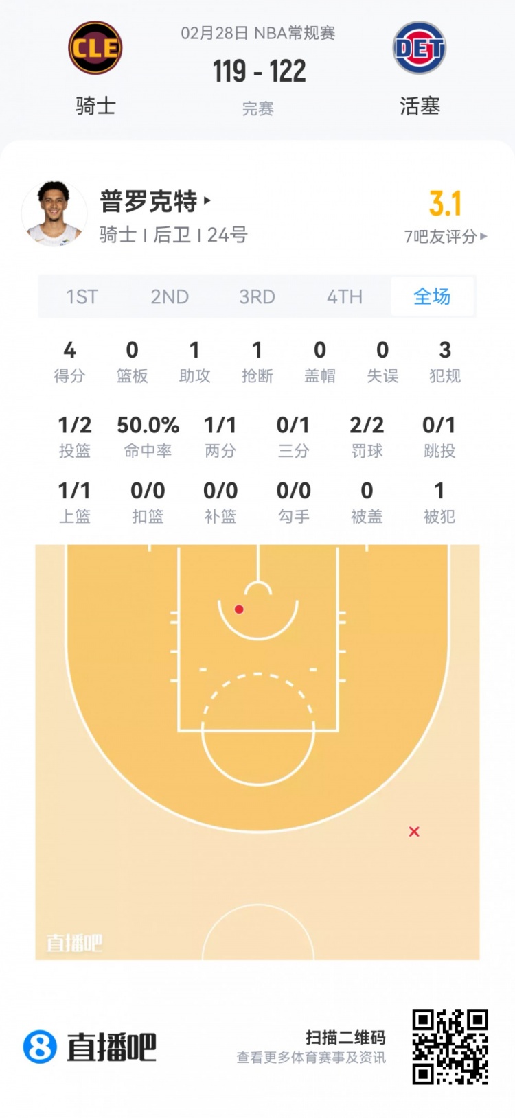 骑士次轮49号秀泰瑞斯·普罗克特 登场18.9分钟